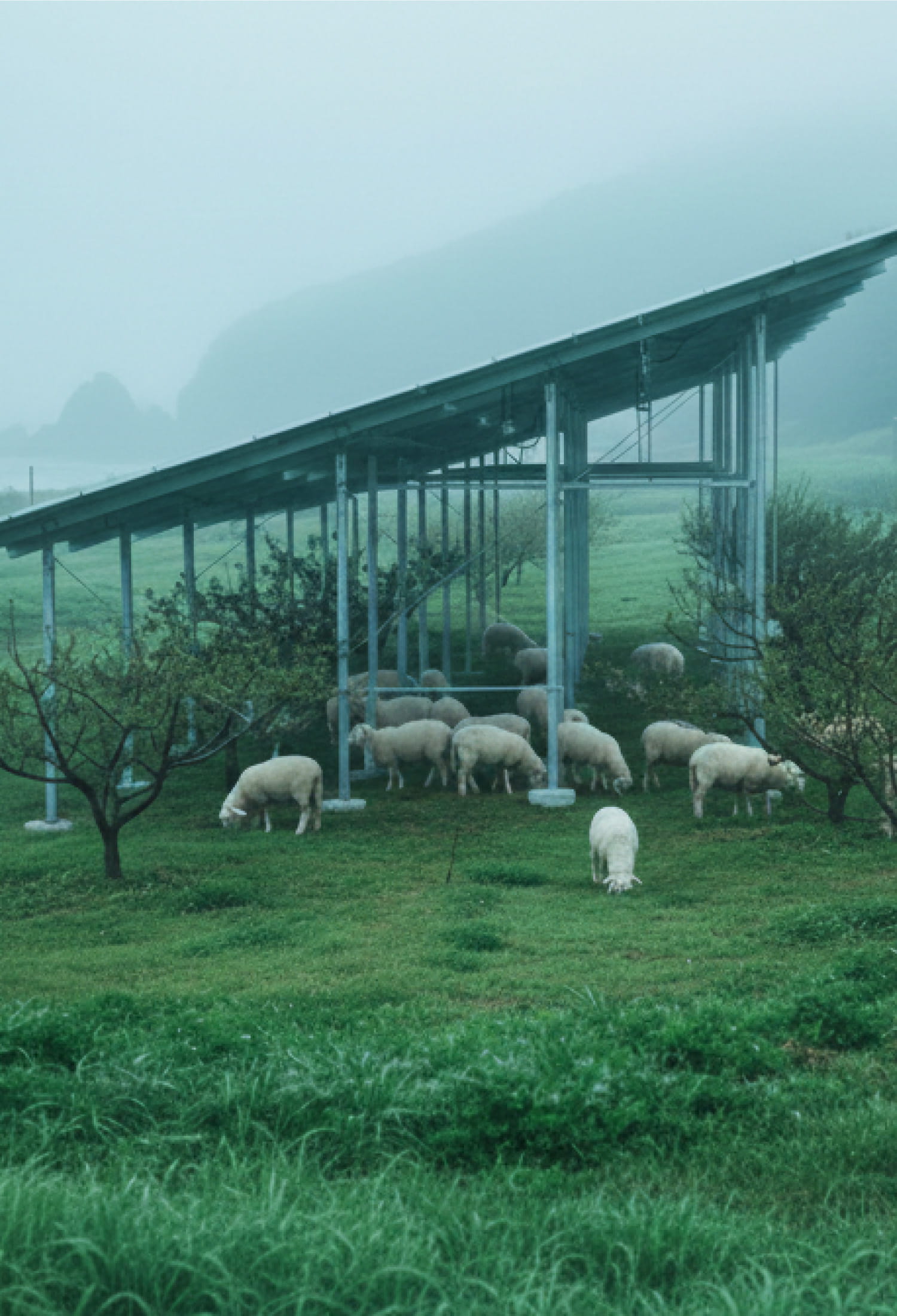 太陽光パネルが生み出す「ほどよい日陰」は、夏場の羊たちにとっても、デリケートな梅の若木にとっても、過ごしやすい環境を提供します。ただエネルギーをつくるだけでなく、動物が健やかに過ごし、作物がゆっくりと育つ。私たちはこの「アグロフォレストリー型ソーラーグレージング(三層循環農業モデル)」を通じて、エネルギーと農業、そして畜産が共生する、持続可能な地域の未来を体現していきます。私たちは営農型太陽光発電の下部空間を活用して、羊放牧・太陽光・果樹(梅)を複合的に組み合わせたアグロフォレストリー型ソーラーグレージングの国内先行・実証モデルの構築を目的としています。本モデルは、エネルギー生産と農業生産を高い次元で両立させる「多層循環型農業」の先駆的取り組みです。国内における希少性が高く、将来的に全国への横展開が可能な、再生可能エネルギーの新たな活用形態を確立します。